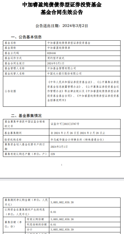 中国经济网北京3月4日讯 近日,中加基金管理有限公司发布中加睿盈纯债债券型证券投资基金基金合同生效公告。