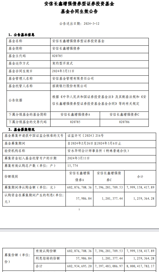 中国经济网北京3月12日讯 今日,安信基金管理有限责任公司发布安信长鑫增强债券型证券投资基金基金合同生效公告。