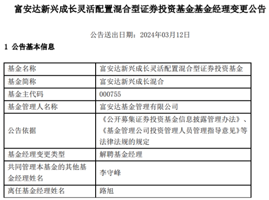 中国经济网北京3月12日讯 今日,富安达基金管理有限公司公告称,路旭离任富安达新兴成长混合(A类000755;C类014471)、富安达科技领航混合(A类009380;C类018987)。