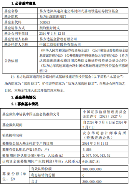 中国经济网北京3月13日讯 今日,易方达基金发布易方达深高速高速公路封闭式基础设施证券投资基金基金合同生效公告。