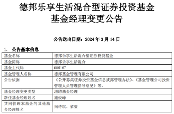 中国经济网北京3月14日讯 今日,德邦基金管理有限公司公告称,德邦乐享生活混合(A类006167;C类006168)增聘基金经理施俊峰。