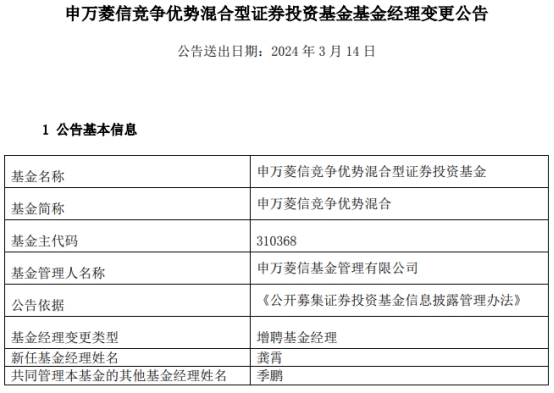 中国经济网北京3月14日讯 今日,申万菱信基金管理有限公司公告称,申万菱信竞争优势混合(A类310368;C类015173)增聘基金经理龚霄。