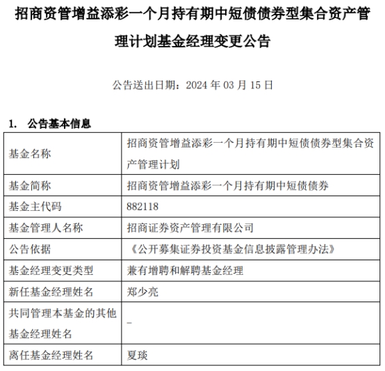 招商资管增益添彩一个月持有期增聘郑少亮 夏琰离任