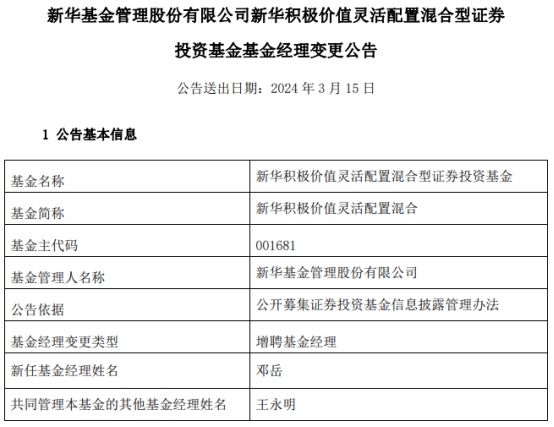 新华积极价值灵活配置混合增聘基金经理邓岳