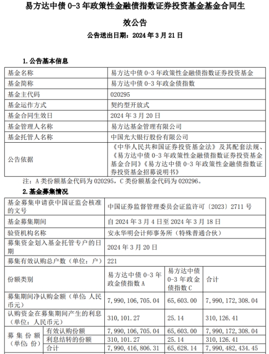 易方达中债0-3年政金债指数成立 基金规模79.9亿元