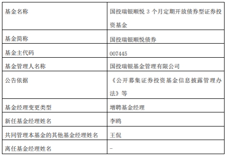 中国经济网北京3月27日讯 今日,国投瑞银基金管理有限公司公告,国投瑞银顺悦债券增聘基金经理李鸥。