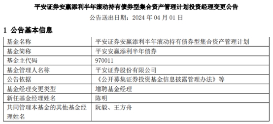 中国经济网北京4月1日讯 近日,平安证券股份有限公司公告称,平安安赢添利半年债券(A类970011、B类970012、C类970013、D类970014)增聘基金经理陈明。