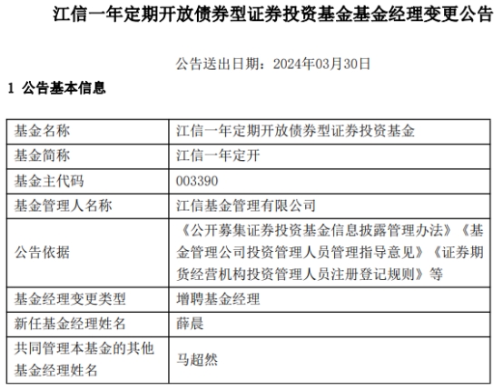 中国经济网北京4月1日讯 近日,江信基金管理有限公司公告称,江信一年定期开放债(003390)增聘基金经理薛晨。