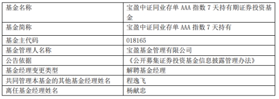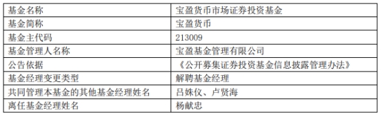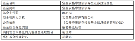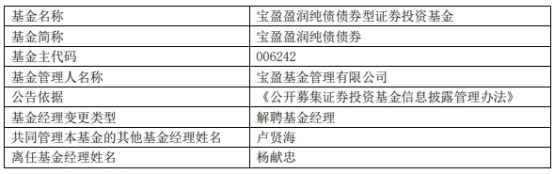 中国经济网北京4月2日讯 今日,宝盈基金管理有限公司公告称,杨献忠离任宝盈盈润纯债债券、宝盈中证同业存单AAA指数7天持有、宝盈安盛中短债债券、宝盈货币。