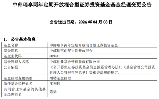 中邮瑞享两年定期开放混合增聘基金经理江刘玮