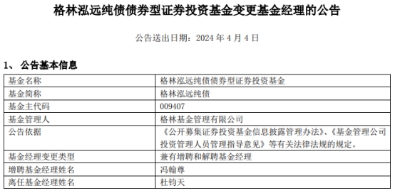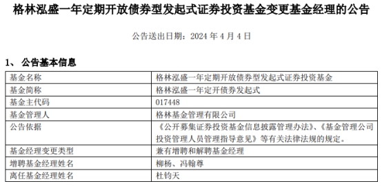 中国经济网北京4月8日讯 近日,格林基金管理有限公司公告称,杜钧天离任格林泓盛一年定开债券发起式(017448)、格林泓远纯债(A类009407;C类009408)。其中,格林泓盛一年定开债券发起式增聘基金经理柳杨、冯翰尊,格林泓远纯债增聘基金经理冯翰尊。