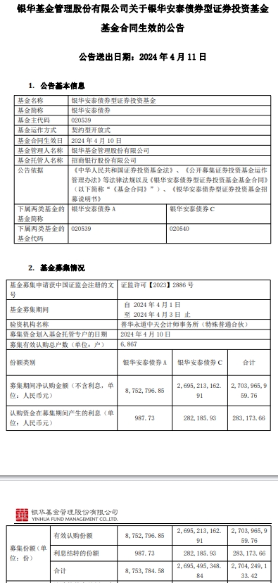该基金募集期间净认购金额合计2,703,965,959.76元,认购资金在募集期间产生的利息合计283,173.66元,募集份额合计2,704,249,133.42份。
