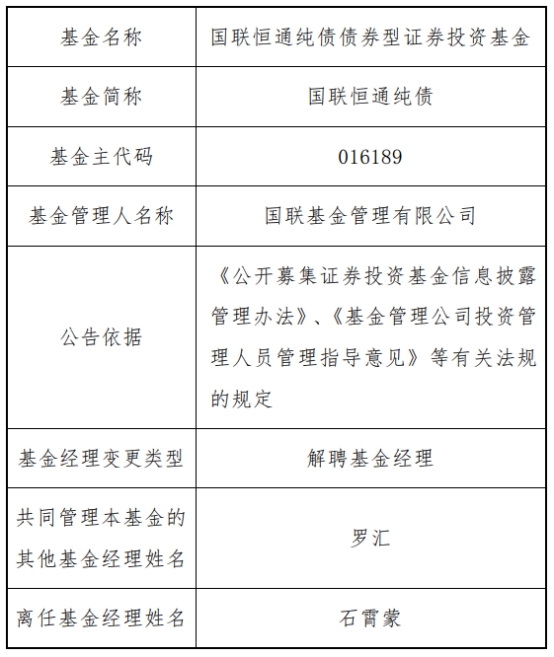 中国经济网北京4月11日讯 今日,国联基金管理有限公司公告称,石霄蒙因工作安排离任国联恒通纯债(A类016189;C类016190)、国联恒润纯债(A类016955;C类016956)、国联恒泽纯债(A类014257;C类014258)。
