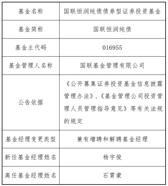 与此同时,国联恒润纯债增聘基金经理杨宇俊。杨宇俊毕业于对外经济贸易大学金融学专业,研究生、博士学位,具有基金从业资格。2013年5月至2022年6月历任中加基金管理有限公司专户投资经理、固定收益部基金经理、部门主管。2022年6月加入国联基金管理有限公司,现任固收投资三部总经理。