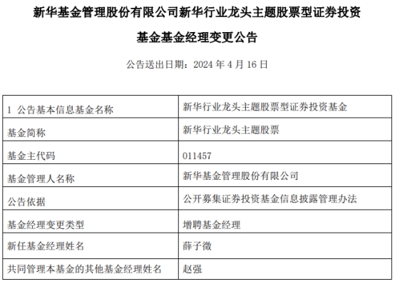中国经济网北京4月16日讯 今日,新华基金管理股份有限公司公告称,新华行业龙头主题股票(011457)增聘基金经理薛子徵。