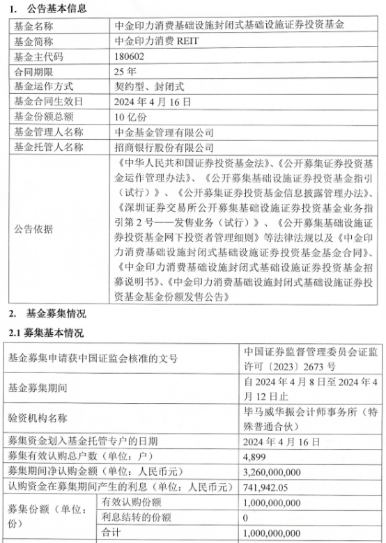 中金印力消费REIT成立 基金规模32.6亿元