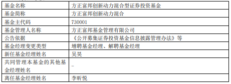 方正富邦创新动力混合增聘基金经理吴昊 李昕悦离任