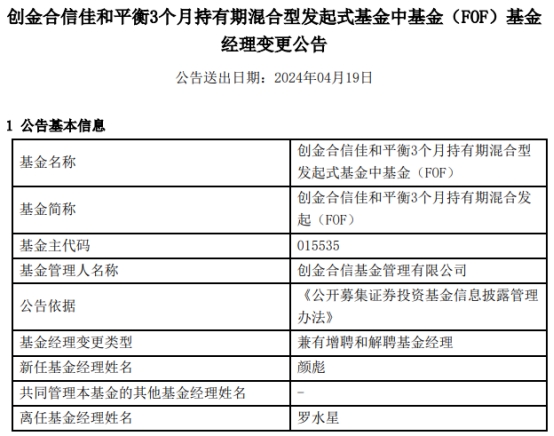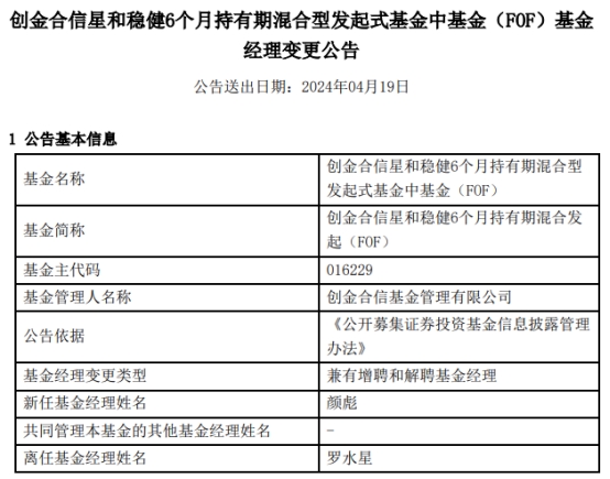 中国经济网北京4月19日讯 今日,创金合信基金管理有限公司公告称,创金合信星和稳健6个月持有期混合发起(FOF)(A类016229;C类016230)、创金合信佳和平衡3个月持有期混合发起(FOF)(A类015535;C类015536)增聘基金经理颜彪,罗水星离任。