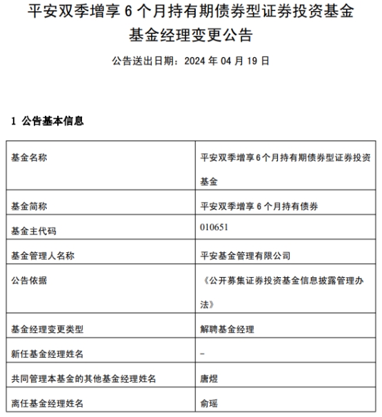 中国经济网北京4月19日讯 今日,平安基金管理有限公司公告称,俞瑶离任平安双季增享6个月持有债券(A类010651;C类010652)。