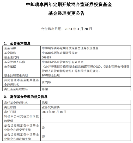 中国经济网北京4月22日讯 近日,中邮创业基金管理股份有限公司公告称,陈梁因业务发展需要离任中邮瑞享两年定期开放混合(A类009415;C类009416)。