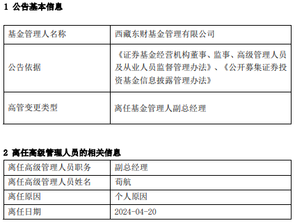 中国经济网北京4月22日讯 近日,西藏东财基金管理有限公司发布基金行业高级管理人员变更公告,副总经理荀航因个人原因于2024年4月20日离任。
