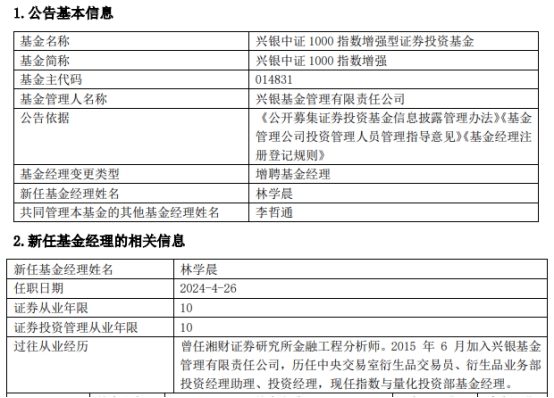 兴银中证1000指数增强增聘基金经理林学晨