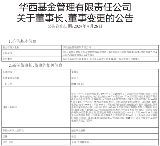 公告显示,程华子1994年1月至2000年6月历任泸州老窖股份有限公司党委秘书、秘书处处长、办公室主任;2000年6月至2007年9月历任泸州老窖集团有限责任公司办公室主任、总裁秘书、人力资源企业管理部部长(兼人力资源部部长);2007年9月至2014年7月历任华西证券有限责任公司总裁助理兼总裁办主任、副总裁、董事、董事会秘书;2014年7月至2015年2月担任华西证券股份有限公司董事、副总裁、董事会秘书兼总裁办主任;2015年2月至2015年9月担任华西证券股份有限公司董事、副总裁、董事会秘书兼战略与人力资源部总经理;2015年9月至2016年2月担任华西证券股份有限公司董事、副总裁、董事会秘书兼人力资源总监;2016年2月至2020年11月担任华西证券股份有限公司董事、副总裁兼人力资源总监;2020年11月至今任华西证券股份有限公司职工董事、董事、副总裁兼人力资源总监;2021年11月至今任华西基金管理有限责任公司董事。