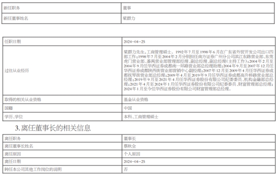 中国经济网北京4月26日讯 今日,华西基金管理有限责任公司发布关于董事长、董事变更的公告。公告称,公司董事长蔡秋全因个人原因于2024年4月25日离任,程华子任董事长,梁群力任董事。