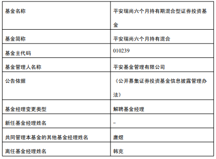 韩克离任平安瑞尚六个月持有混合 唐煜管理