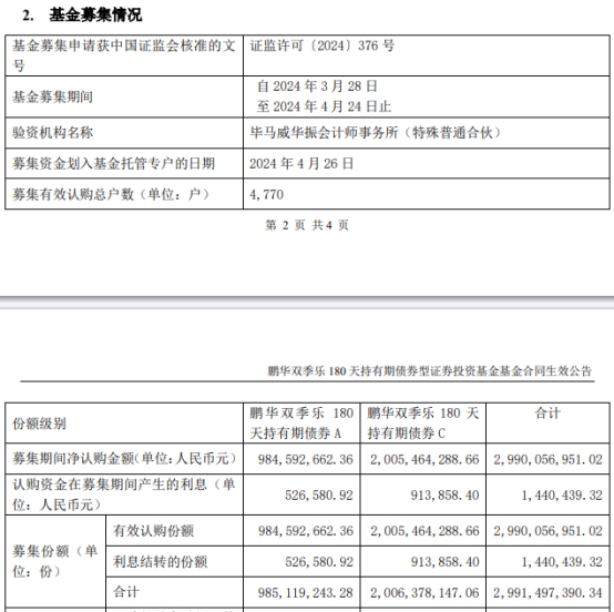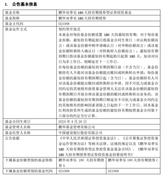 鹏华双季乐180天持有期债券成立 基金规模29.9亿元