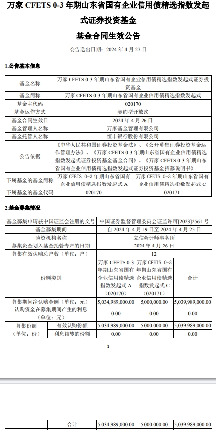 中国经济网北京4月29日讯 近日,万家基金管理有限公司发布万家CFETS 0-3年期山东省国有企业信用债精选指数发起式证券投资基金基金合同生效公告。