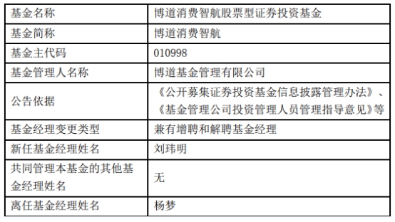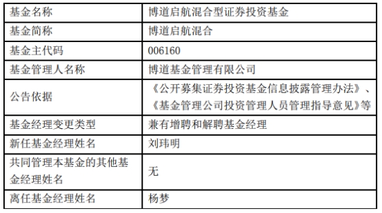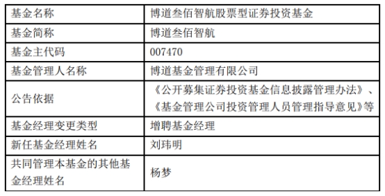 中国经济网北京4月29日讯 今日,博道基金管理有限公司公告称,博道消费智航(A类010998;C类018695)、博道叁佰智航(A类007470;C类007471)、博道启航混合(A类006160;C类006161)增聘基金经理刘玮明,杨梦因工作调整离任博道消费智航、博道启航混合,杨梦继续担任量化投资总监兼量化投资部总经理。