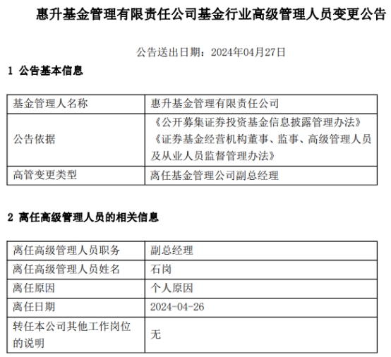 惠升基金副总经理石岗离任