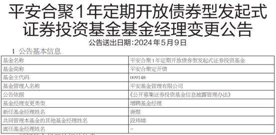 中国经济网北京5月9日讯 今日,平安基金管理有限公司公告称,平安合聚定开债(009148)增聘基金经理唐煜。