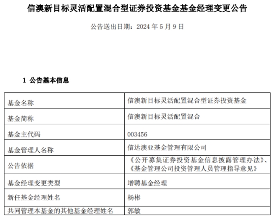 信澳新目标灵活配置混合增聘基金经理杨彬