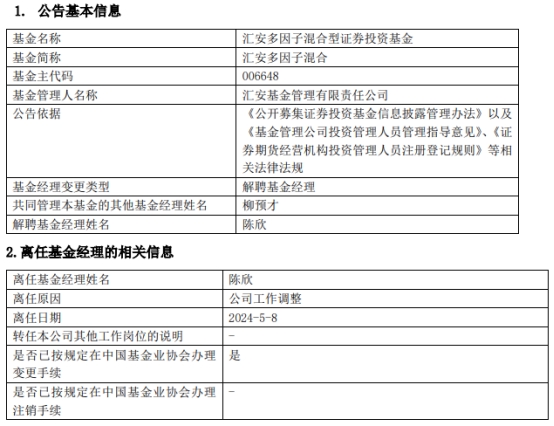 中国经济网北京5月10日讯 昨日,汇安基金管理有限责任公司公告称,陈欣因公司工作调整离任汇安多因子混合(A类006648;C类006649)。