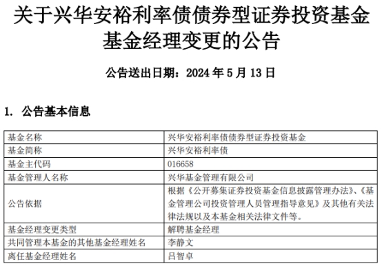 中国经济网北京5月13日讯 今日,兴华基金管理有限公司公告称,吕智卓离任兴华安裕利率债(A类016658;C类016659)。