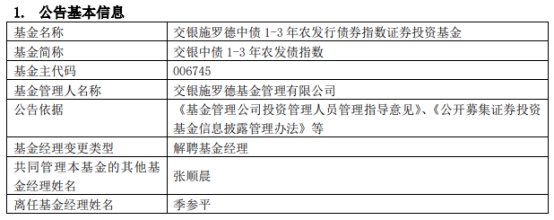 中国经济网北京5月14日讯 今日,交银施罗德基金管理有限公司公告称,季参平因工作安排离任交银中债1-3年农发债指数(A类006745;C类006746;D类020342)、交银裕景纯债一年定期开放债券(013419)。