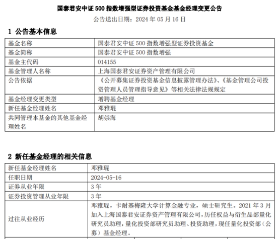 国泰君安中证500指数增强增聘基金经理邓雅琨