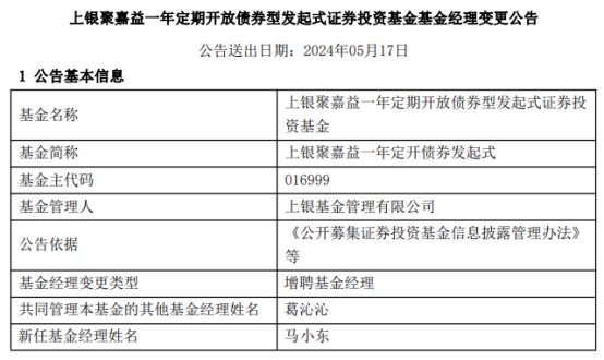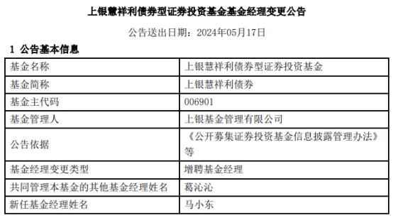 上银基金2只债基增聘基金经理马小东