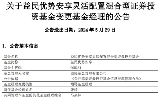 中国经济网北京5月29日讯 今日,益民基金管理有限公司公告称,益民优势安享(A类005331;C类020282)增聘基金经理张婷。