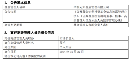 华润元大基金市场负责人周明离任