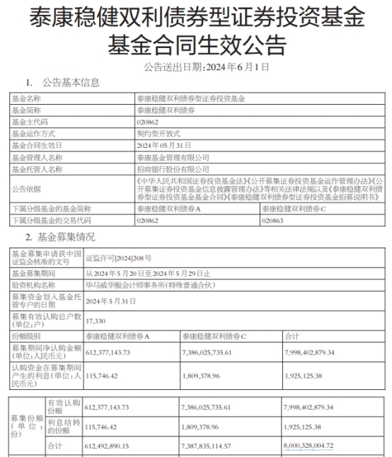 中国经济网北京6月3日讯 近日,泰康基金管理有限公司发布泰康稳健双利债券型证券投资基金基金合同生效公告。