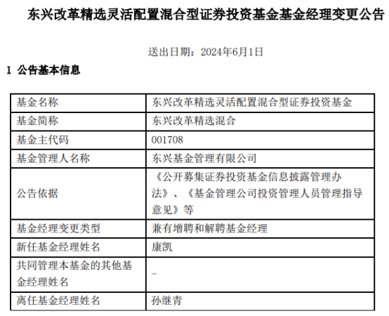 东兴改革精选混合增聘基金经理康凯 孙继青离任