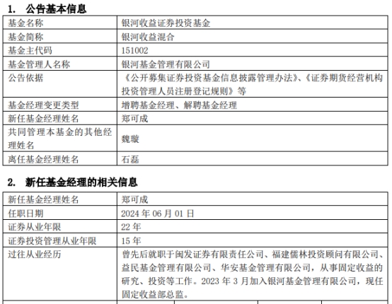 中国经济网北京6月3日讯 近日,银河基金管理有限公司公告称,银河收益混合(151002)增聘基金经理郑可成,石磊离任。
