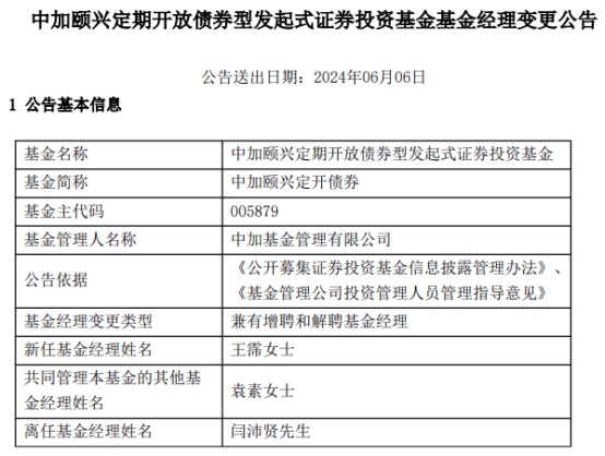 中加颐兴定开债券增聘基金经理王霈 闫沛贤离任