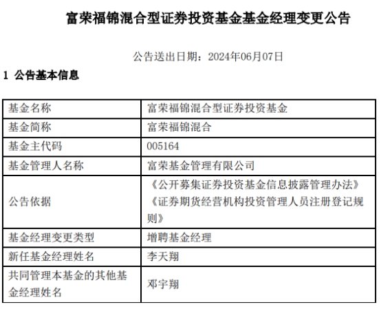 中国经济网北京6月7日讯 今日,富荣基金管理有限公司公告称,富荣福锦混合(A类005164;C类005165)增聘基金经理李天翔。