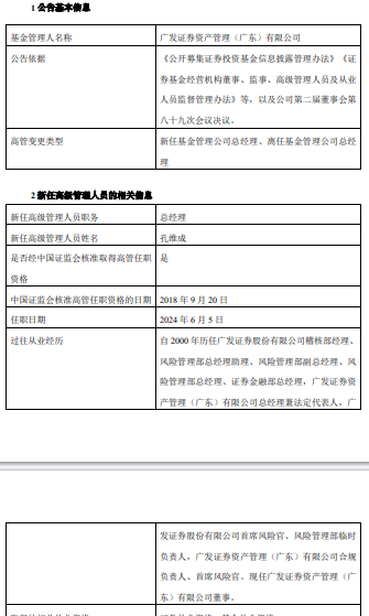 中国经济网北京6月7日讯 今日,广发证券资产管理(广东)有限公司发布基金行业高级管理人员变更公告,任命孔维成为总经理,原总经理秦力因工作安排离任,继续担任董事长职务。