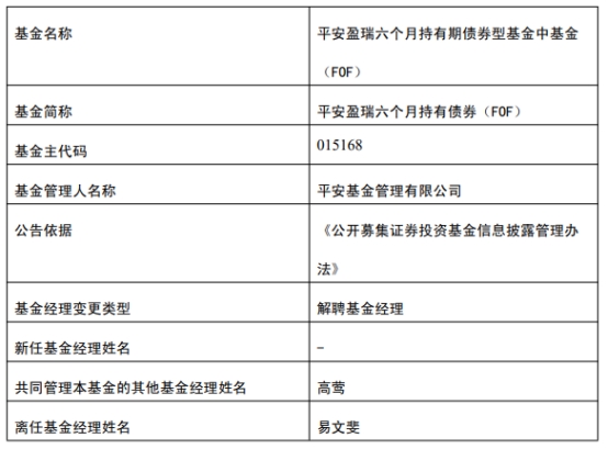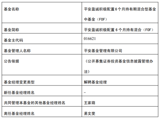 中国经济网北京6月11日讯 近日,平安基金管理有限公司公告称,易文斐因工作需要离任平安盈诚积极配置6个月持有混合(FOF)、平安盈瑞六个月持有债券(FOF)。