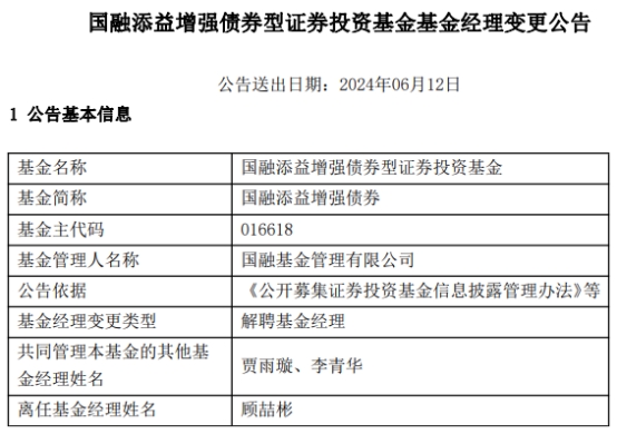 中国经济网北京6月12日讯 今日,国融基金管理有限公司公告称,顾喆彬因公司安排离任国融添益增强债券(A类016618;C类016619)。